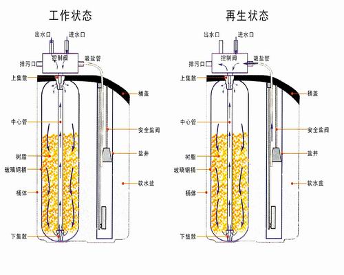 3. 均勻布水系統(tǒng):采用射流式布水,樹脂有效交換容量得以充分發(fā)揮,用鹽控制精確,無須鹽泵。