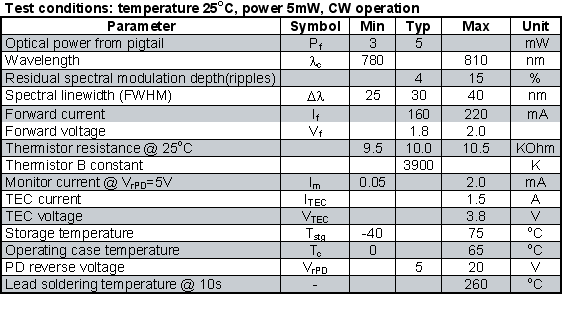 光纖耦合窄線寬SLD蝶形激光器,中心波長790nm,功率5mW