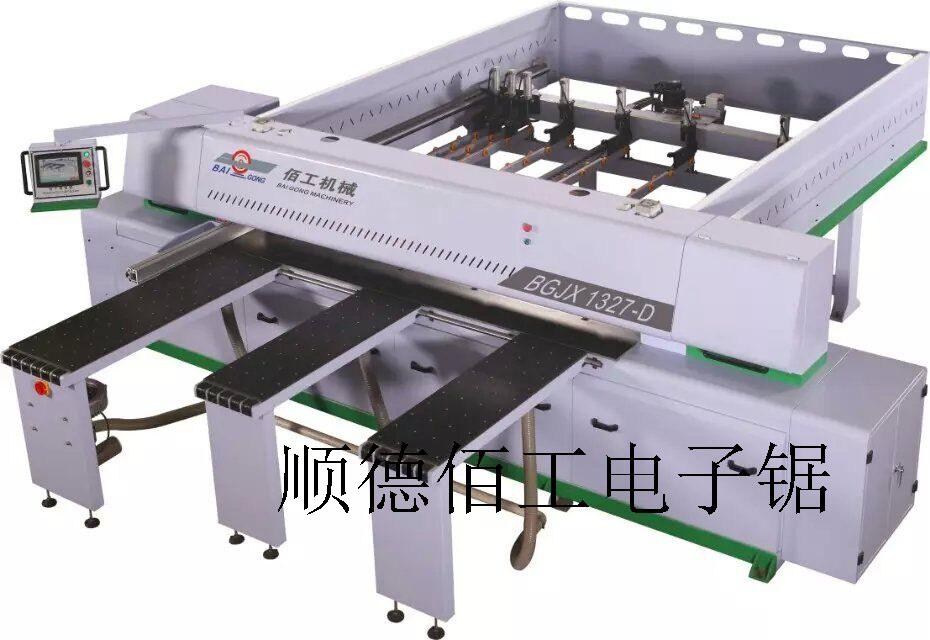 工作流程:工人把要加工原板料放入電子開料鋸的工作臺面或由自動上料設備上料----按鍵指示夾鉗夾緊板料---啟動自動運行----進入自動工作---自動定位---自動齊邊---自動鋸裁----自動出料---按所輸入的數(shù)據(jù)自動全部完成裁切