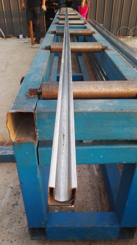 3. 成型:在成型機(jī)上首先將預(yù)彎后的鋼板的一半經(jīng)過多次步進(jìn)沖壓,壓成"C"形,再將鋼板的另一半同樣彎曲,壓成"U"形,最后形成凹槽管