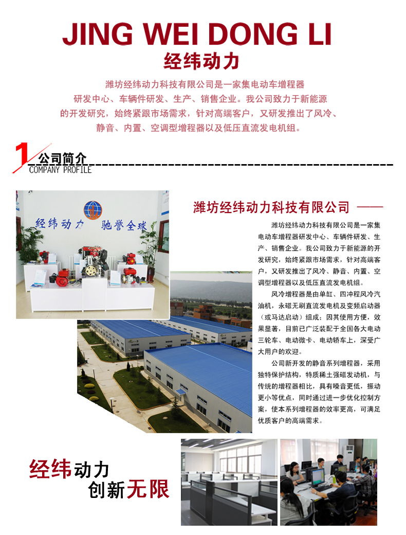 濰坊經(jīng)緯動(dòng)力科技有限公司是一家集電動(dòng)車增程器研發(fā)中心、車輛線束研發(fā)中心、車身鈑金加工中心等為一體的現(xiàn)代化新能源汽車部件研發(fā)、生產(chǎn)、銷售企業(yè)。公司致力于新能源的開發(fā)研究,始終緊跟市場需求,針對(duì)高端客戶,研發(fā)推出了170系列風(fēng)冷、靜音、內(nèi)置電機(jī)、自動(dòng)油門、空調(diào)等系列的增程器,即jw-1增程器;另外,公司根據(jù)客戶需求,研發(fā)生產(chǎn)了水冷系列增程器,即jw-2增程器;公司近期最新研制的GY6系列即JW-3增程器,功率大、超靜音,動(dòng)力運(yùn)轉(zhuǎn)更持久,與電動(dòng)車匹配性能更優(yōu),舒適性更好,深受客戶的好評(píng)!公司研發(fā)部正在研發(fā)生產(chǎn)新一代增程器即jw-4增程器,即將投放市場,相信不久的將來,會(huì)給大家?guī)砀嗟姆奖闩c舒適! 經(jīng)緯動(dòng)力,與您一路同行!