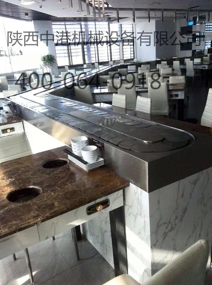 菜品,衛(wèi)生方便時尚。轉轉火鍋實際上就是顧客圍坐在長條形桌子兩側,食用桌子中間滾動轉送的蔬