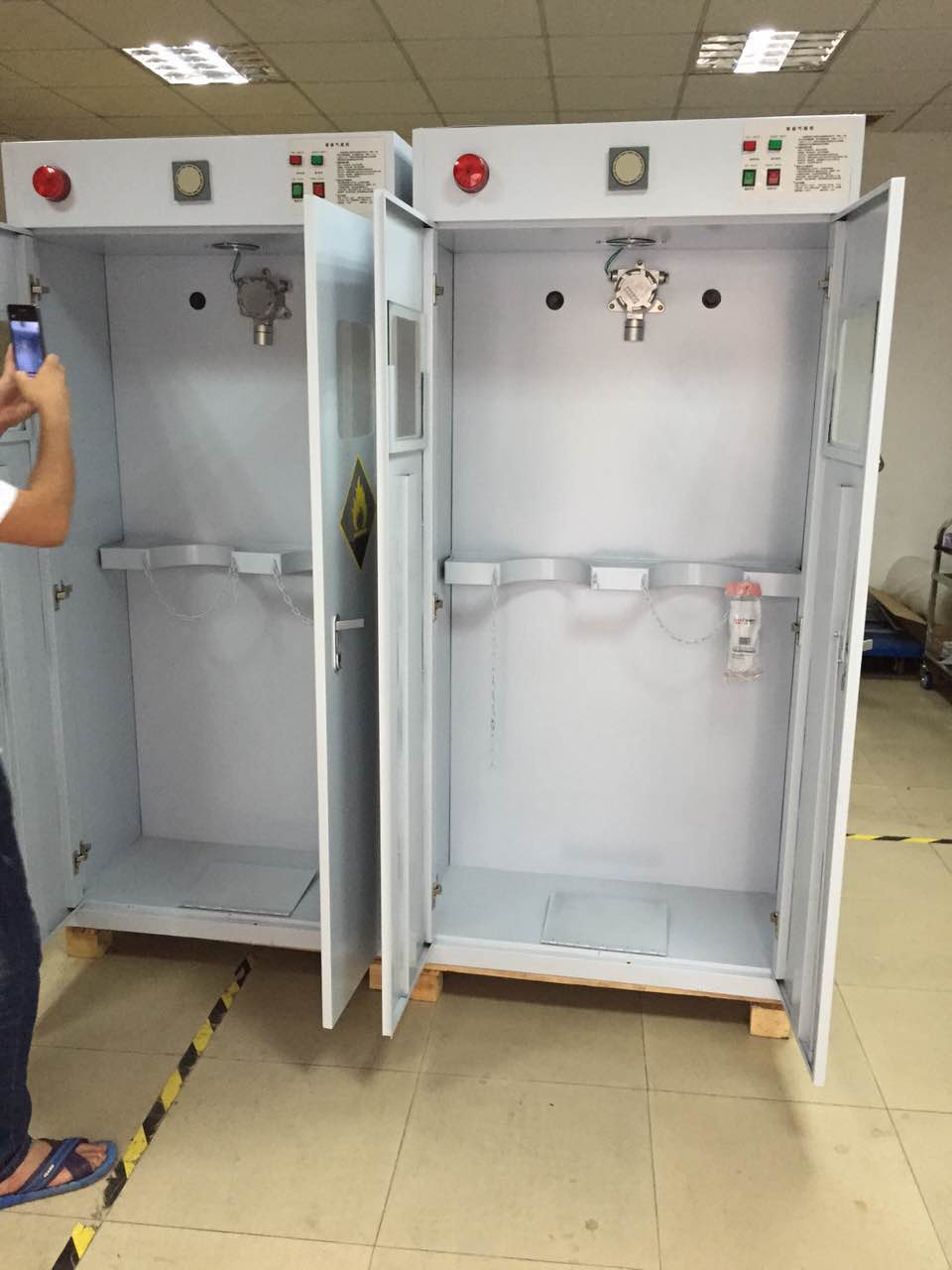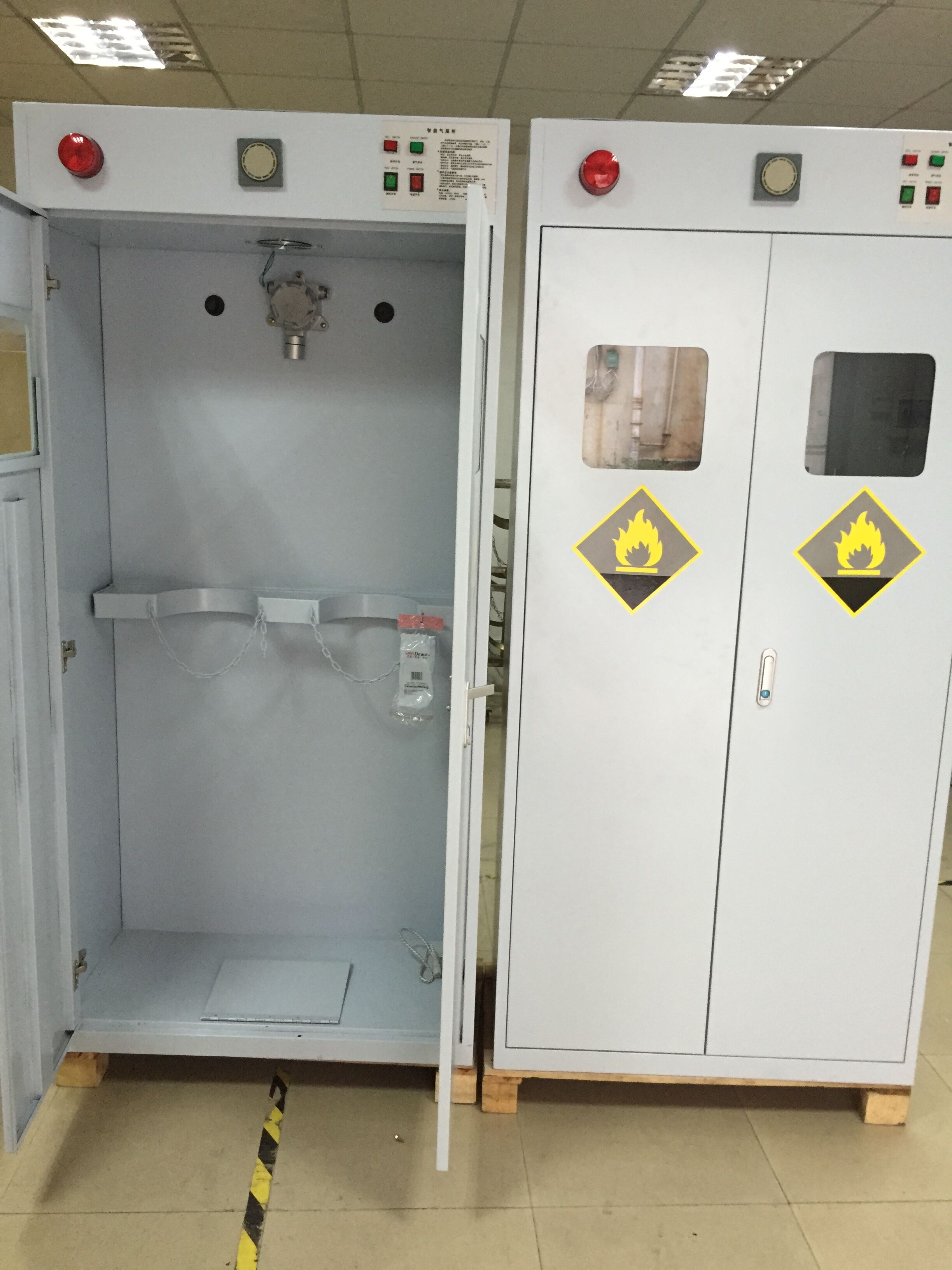 .聲光報(bào)警系統(tǒng):當(dāng)柜內(nèi)傳感器檢測到氣體泄漏時,會自動觸發(fā)紅燈閃爍和報(bào)警轟鳴聲,同時自動排風(fēng)。