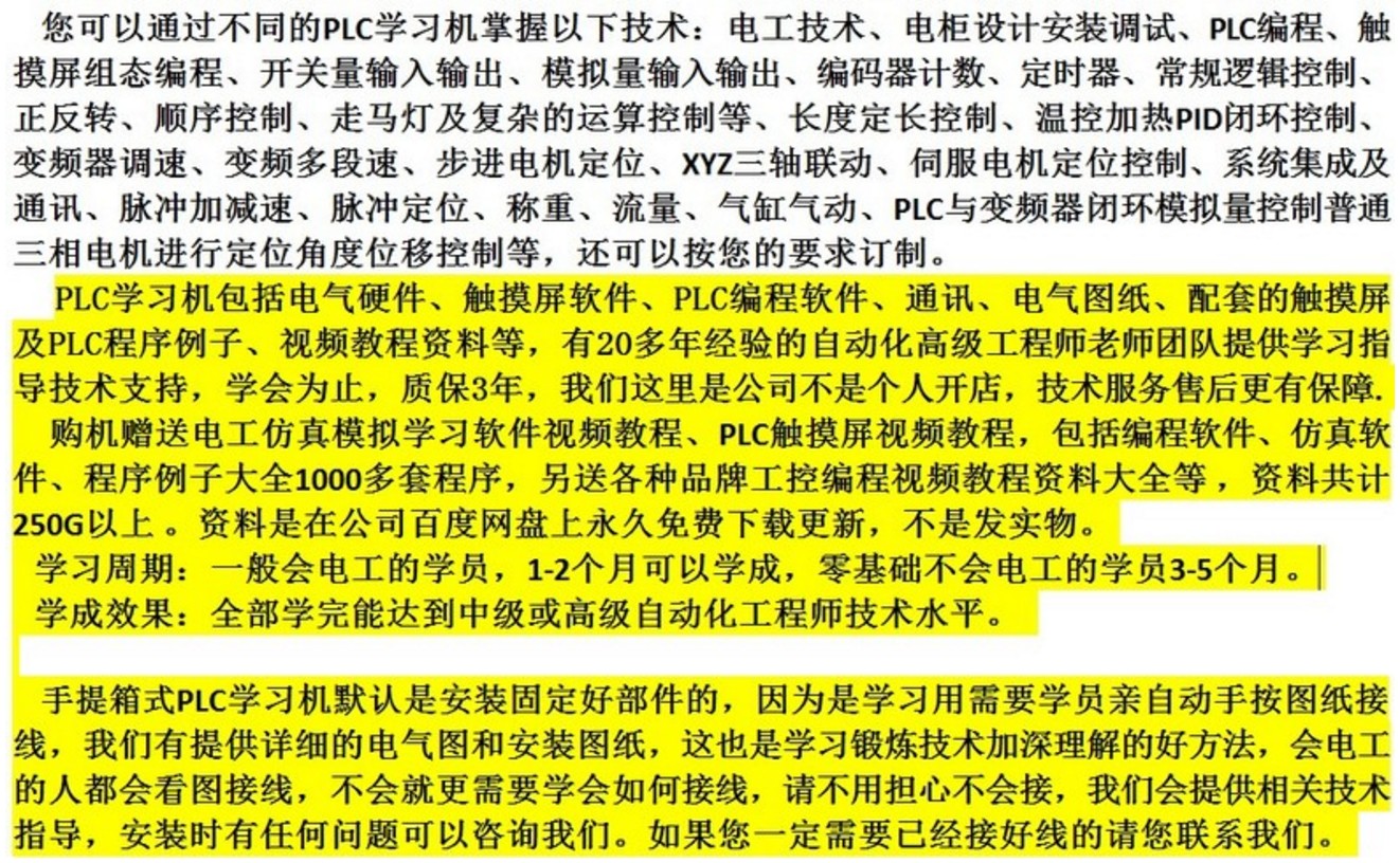 學(xué)習(xí)機包括了所有硬件、軟件、圖紙、程序、通訊、實驗指導(dǎo)書、視頻教程例子資料等,質(zhì)保期兩年。學(xué)習(xí)機已經(jīng)編好了PLC和觸摸屏的程序,帶有注釋,有自動化高級工程師老師進行全程學(xué)習(xí)指導(dǎo)和技術(shù)支持。