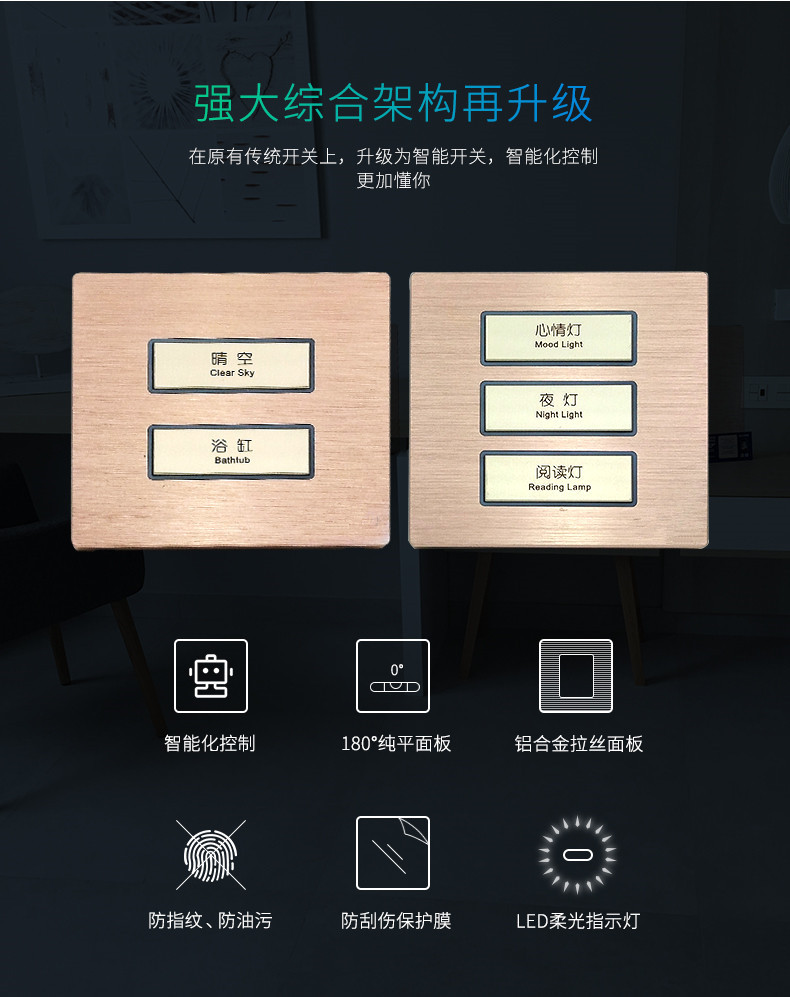 主營(yíng)產(chǎn)品:酒店照明開(kāi)關(guān)面板,調(diào)光控制器模塊,窗簾控制模塊,空調(diào)控制模塊