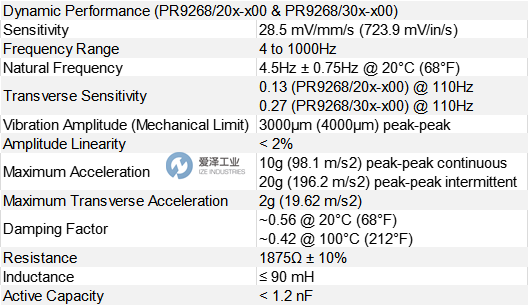 靈敏度 (± 5%) @ 80 Hz/20°C/100 kOhm:28.5 mV/mm/s (723.9 mV/in/s)