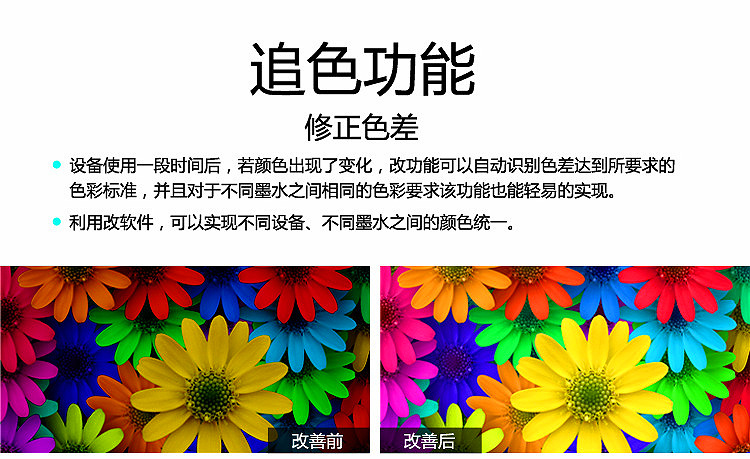 2、高精度打印:使用公司生產(chǎn)的專(zhuān)用墨水,使輸出的圖象效果真,達(dá)到照片品質(zhì)。圖像防水,防曬,耐磨損,不褪色。